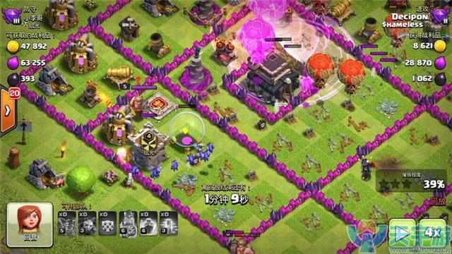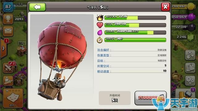 玩法中,多是利用气球兵在前排吸引敌军火力,同时针对性的进攻敌军各类强势防守建筑,然后搭配后方的亡灵和双王进行组合推进,在防守建筑被气球兵解除后,亡灵的生存能力会很高。法术选择方面,如果能够有治疗法术持续的给予气球兵血量恢复,以及狂暴法术让其进攻更具爆发,那么整体的压制能力会更强,破坏率较高!
