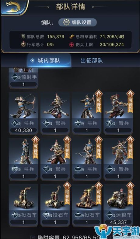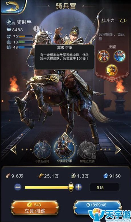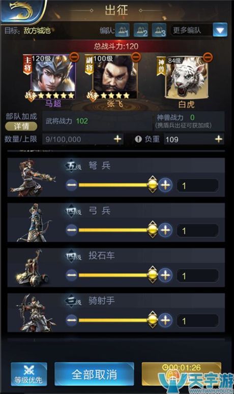骑兵优先冲锋远程。我们很多人的盾枪流往往只带盾兵和枪兵,而现在,我们已知敌人是盾骑的话,我们可以配置千排流,在已有盾兵和枪兵的情况下,配置大量混杂兵种,每种兵种带1个即可,比如我们带上1-10级弓兵、弩兵,那么骑兵会优先冲锋远程部队。举个例子,假如我方有3万盾兵、69999枪兵与1个弓兵,即使敌人有10万骑兵,那么发动冲锋之后,也只会对1个弓兵造成伤害,在我方部队中有远程部队的时候,骑兵就不会冲锋枪兵。