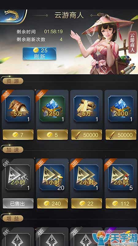 首先云游商人的加速并不容易刷出,尤其是20小时的3折加速,这个看到是必买的一个道具,从性价比分析上来看非常划算。大约6折时,远游商人和金币直接加速大致相当,所以云游商人6折以下的加速,性价比要高于金币直接加速,可以用金币购买。