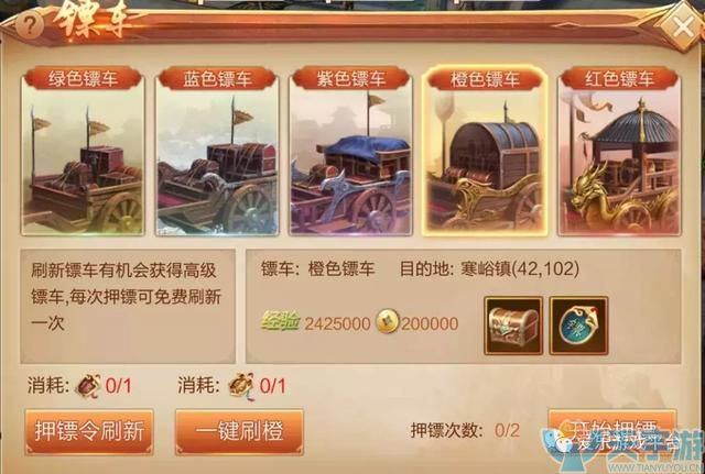 工欲善其事必先利其器,押镖的重中之重是选择合适的镖车,镖车等级从低到高分为绿、蓝、紫、橙、红5种,等级越高,收益也就越好。因此押镖之前先别急着点开始,先用系统提供的“免费刷新”刷下颜色。此外,也可以购买押镖令和高级押镖令进行刷新。