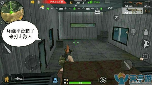 在别墅内部有着一处平台,此平台为别墅的一个小制高点,而且在平台上有一处木箱子,小伙伴们可以环绕着这个木箱子来打击敌人。在平台上打击敌人是比较全面的,不管敌人从哪个房间门口进来,小伙伴们都能及时的切换位置,从而打击淘汰敌人。如果发现有敌人进入内部,此刻应快速的切换到箱子另一侧来打击敌人。利用箱子左右打击敌人,在我们有着障碍物的情况下,敌人是刚强枪不过小伙伴们的。千万不要让敌人接近平台下面,因为在平台下面,对小伙伴们是个盲点,这个时候打击敌人就比较费力了。