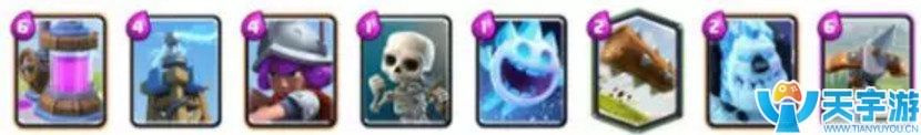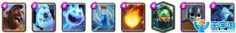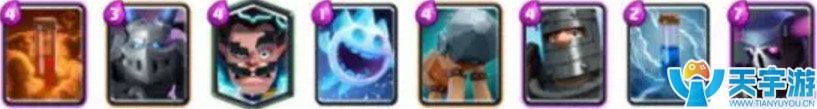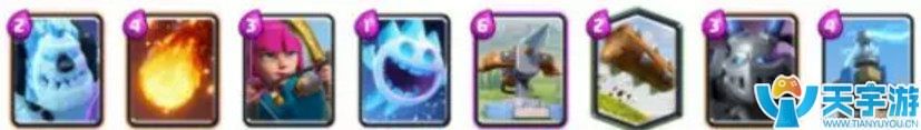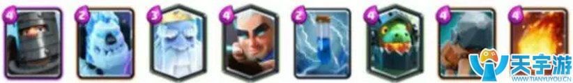 这套卡不管遇到什么卡组都有一战之力,因为这些卡组防御建筑少,所以比较容易突破。