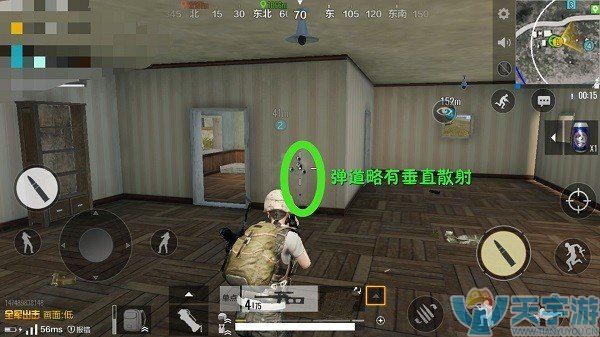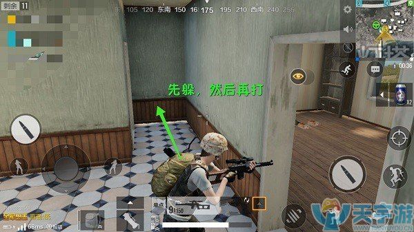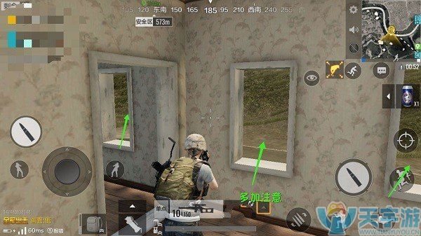 当小伙伴们来到平房里,打算在窗口伏击敌人的时候,我们可以将VSS对准前方窗口的方向,并依此原地伏击。因为VSS自带4倍镜和消音器,所以用VSS躲窗打不容易被敌人察觉,也省去了额外捡镜头的时间。但在窗户千万不要逗留太久,如果有敌人闯过窗户用刀攻击,小伙伴们先退到楼梯附近,然后再定点开镜,将敌人快速击倒。