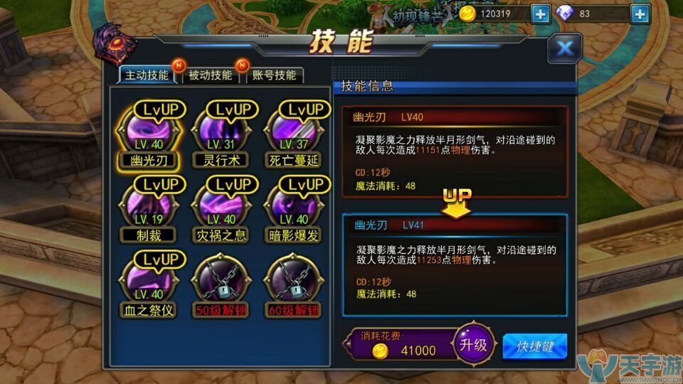 技能1:幽光刃 推荐点满,范围广。伤害适中,冷却较快