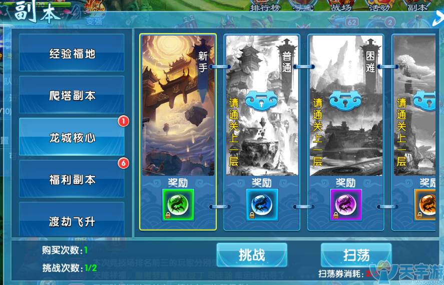 龙城核心:此为通关任务,完成低一级的难度才能挑战更高的难度,通关最高等级难度将会获得神级附魔石,你心动了吗?