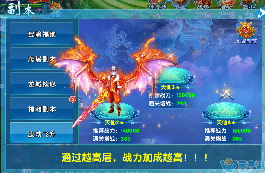 渡劫飞升:战斗力是一切的基础,想要提升战力你还可以来这里渡劫,通过越高层,战力加成越高,你还在等什么,赶紧来挑战吧!