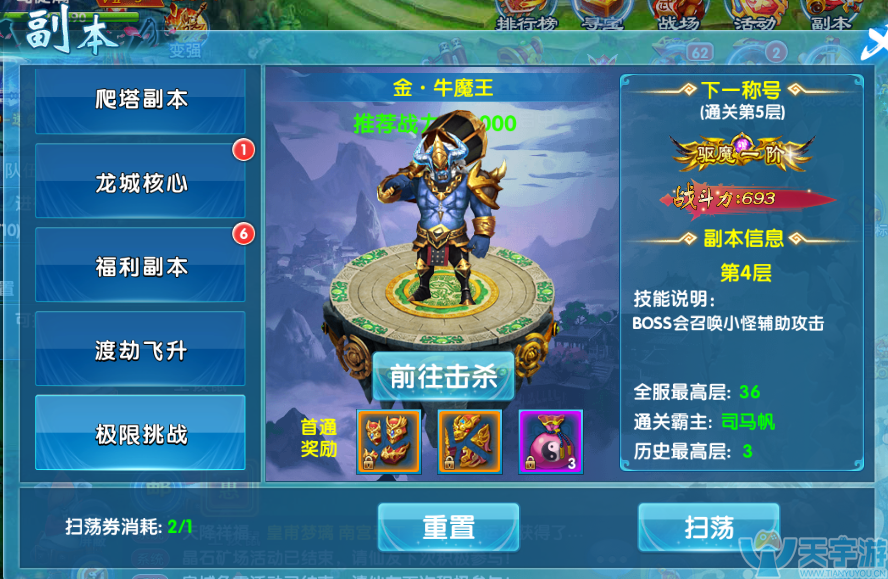 爬塔副本:和通天宝塔活动玩法类似,只是此副本只能击杀BOSS,往上爬得越高奖励也越丰厚,强化材料随手可得!