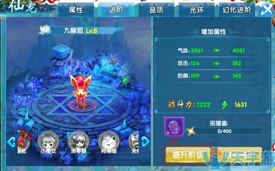 进阶:提升仙宠阶级可增强仙宠属性,消耗一定的仙宠进阶丹便可提升仙宠阶级,玩家可以通过商城进行购买
