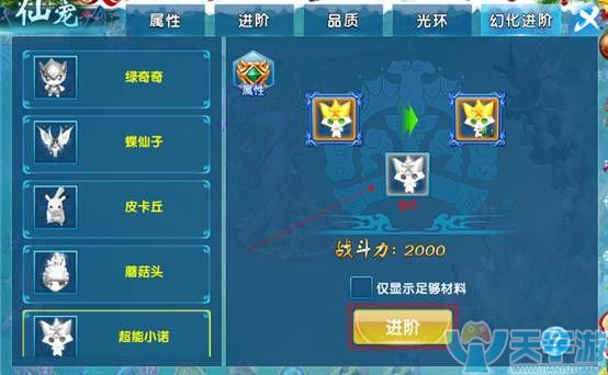 幻化进阶:仙宠可幻化成特殊形象,既美观又能提高战力,玩家可以通过特殊活动或抽奖获得,若是有相同类型则可选择进阶,增加仙宠属性