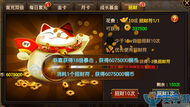 3、招财。参与招财也能获得金币,这个也是获得铜币不错的方法,招财符可以通过挑战花果山副本得到哦