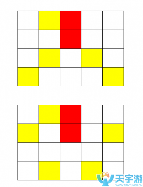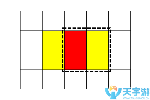 如图中,红色区域为对面骑兵位置,那么有且只有在骑兵侧边黄色区域扔陷阱时,可以对骑兵造成双倍伤害。其实原理是,陷阱的伤害范围是九宫格,刚好在骑兵侧面,也就是黄色区域时,伤害范围可以把马完全罩住,所以就造成双倍伤害咯。