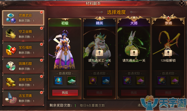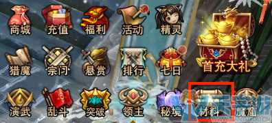 材料副本包括灵兽、坐骑、宝石、强化。金券、法宝6类副本,每类副本每天能够获取一次奖励;每类副本有4个难度,越到后面难度越高,同时奖励也越好。