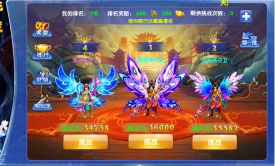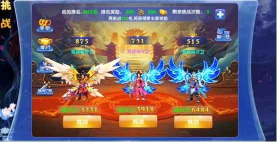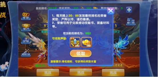 在挑战中,玩家需要通过不停的战胜其他玩家或守卫来提升自己的名次,名次越高,获得的挑战奖励也越多。获得第一名还有特殊称号,有额外属性加成,你还等什么,春风吹,战鼓擂,看看谁怕谁。