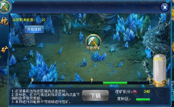 2. 当进度条达到定镐区后,定镐,右侧力气条的将从下方渐渐填满。若在力气条双倍区处挖矿,将获得双倍积分。