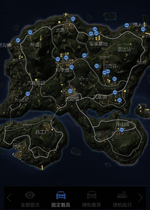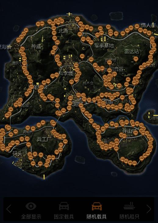 在荒岛特训游戏中,狂杀会逐渐蔓延区域,想要生存下来,往往是比较依赖于载具的,我们这里以陆地上为例。地图上差不多有21个固定载具,当然也有一些随机载具。