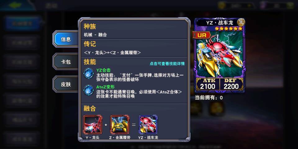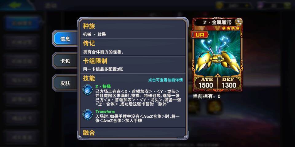 xyz中的z有些1500攻击跟1300的防御说实话身材真的不行。。。(这里身材指怪物攻防数值)不过人家是打融合的是搞配合的这个身材不关键人家是有特殊效果的!入场后如果场上有x或者y存在就可以进行融合然后自身被除外,当手里没有atoz合体时以直接获取一张atoz跟y是一样的效果,这卡本身没有什么强度不过跟xy配合起来简直爆炸,不过z本来就是作为融合素材自身的身材根本就是无关紧要。