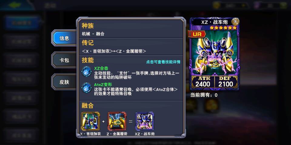 z可以和xy随意融合!可以跟x组成xz战车炮,也可以跟y组成yz战车龙。xz战车炮2400攻击2100的防守而且还有特殊效果支付一张手牌可以破坏对面一张未发动得陷阱卡可谓是稳得一笔,可以说身材是不虚通常的上级怪甚至防御还要高上一些。而zy战车龙攻击2100防守2200呃攻击不如通常的上级怪不过人家有特殊效果可以支付一张牌破坏一张对方防御的怪物相当于一个盾碎的效果很好用的。