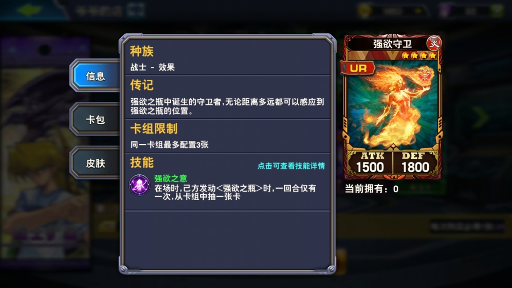 强欲守卫,一张在比赛上出场率很高的牌,这张牌可以配合强欲之瓶来打出,打出后可以获得一次抽牌机会,虽然每回合只能抽取一次,但也是不错的卡牌了。