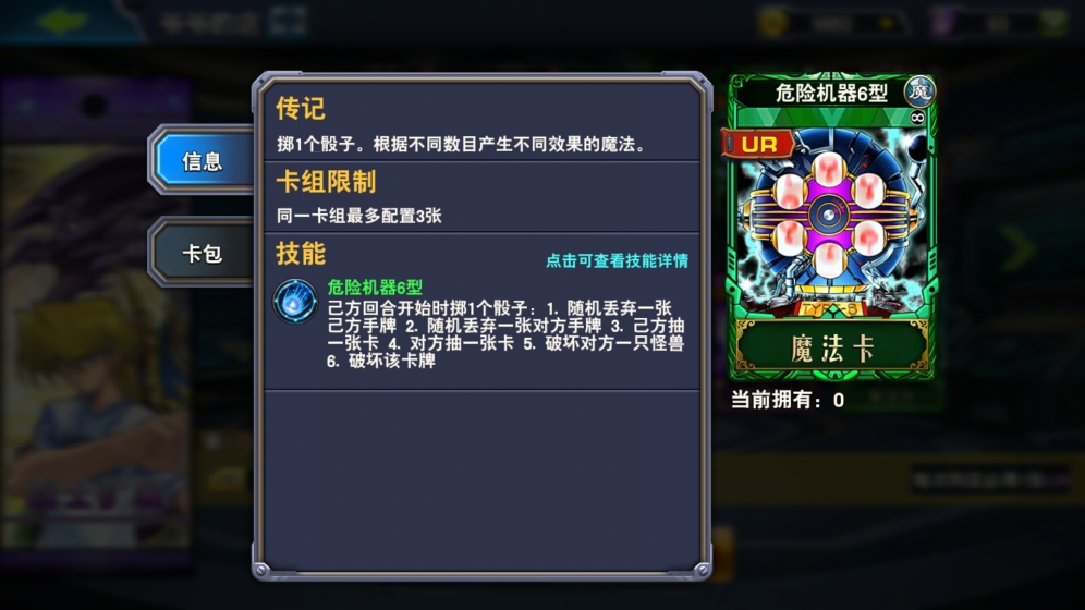 从自己的回合开始扔骰子,扔到一,随机扔自己一张牌,扔到二,随机丢弃对面的一张手牌,扔到三,自己抽一张牌,扔到四,不用说,对面摸一张牌,扔到五,破坏对面一张怪兽,六破坏这张牌。娱乐卡组带上美滋滋,很好玩的一张卡。