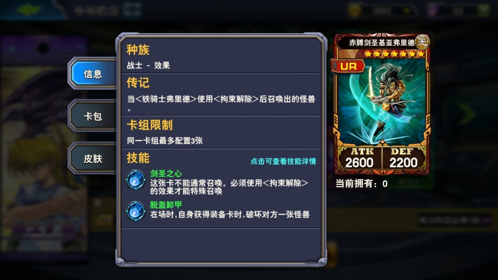 这张牌必须必须当铁骑弗里德使用拘束解除才能召唤,召唤出后,装备一张装备卡破坏对面一张怪兽。在蝶剑满大街的现在可以当雷帝用。