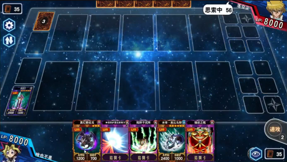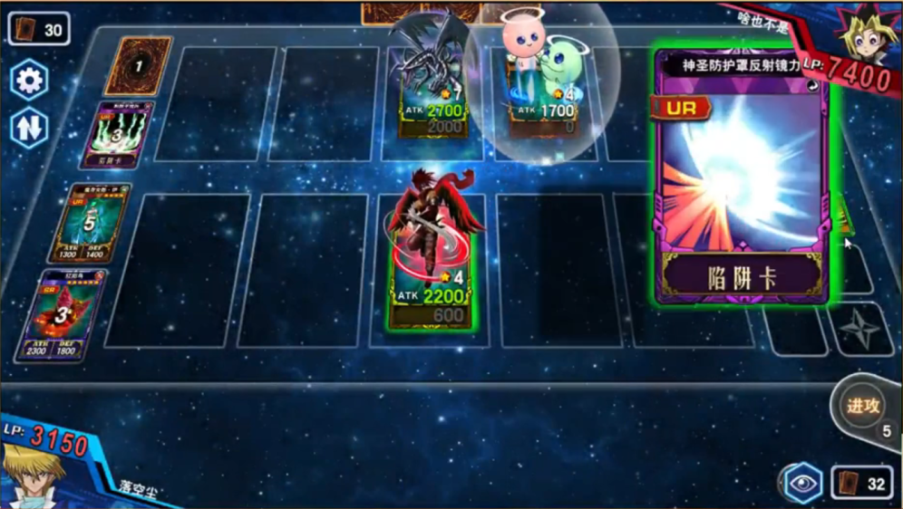 第四回合,啥也不是果然解掉啦三姐妹,不过落空尘抽到了一张神反,但是呢并没有什么用,别忘了啥也不是还有一张陷阱干扰阵站场呢。