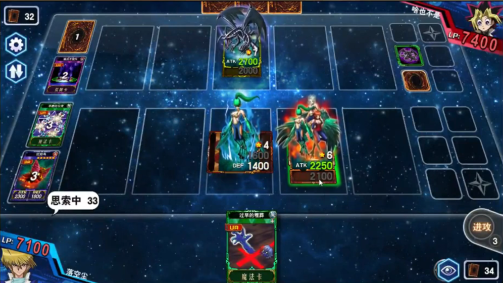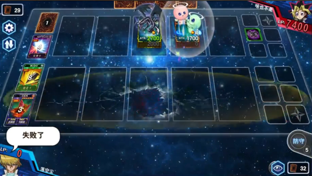 第三回合,落空尘打出羽毛扫想要解掉啥也不是的陷阱区的牌,触发了啥也不是的魔法干扰阵,无效了落空尘的羽毛扫后落空尘又打出一张鹰身女郎伊,并打出一张华丽的分身召出三姐妹,但是如图伤害还不够,下一回合难免还是会被解掉。