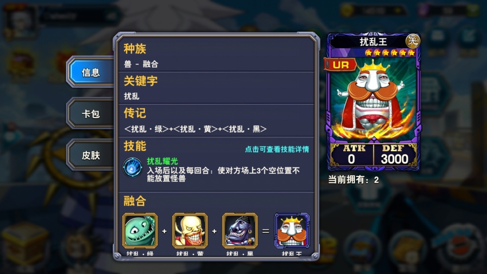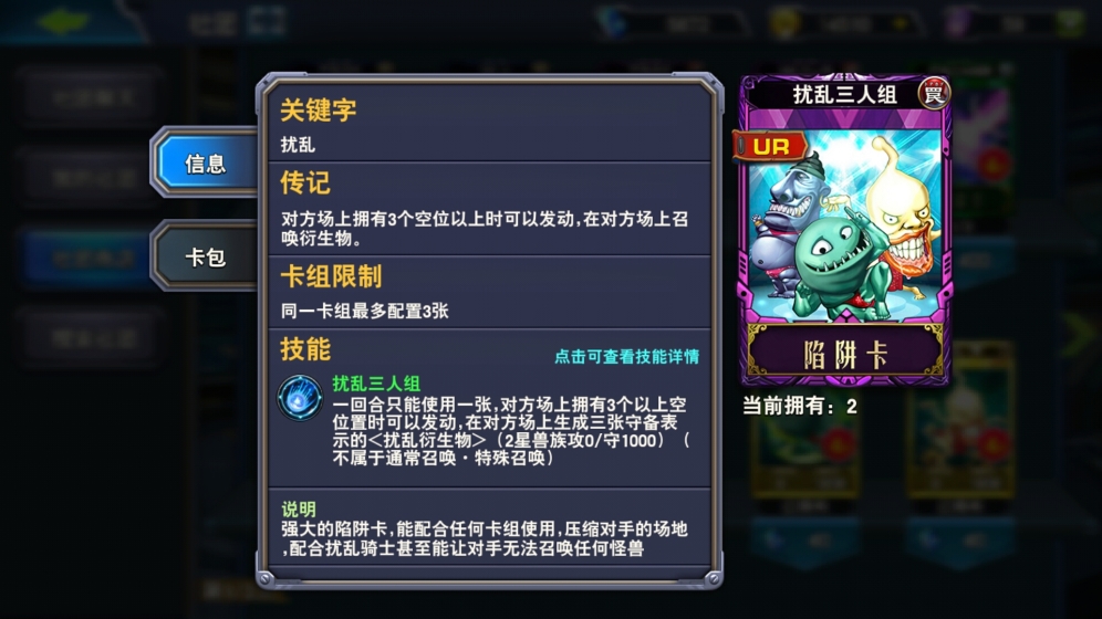 战斗破坏后将两张扰乱关键字的卡牌加入手牌。扰乱蓝可以快速过牌获取其他扰乱素材,如果开局抽到的话,看情况主动撞上去,尽可能快的拿到扰乱三人组限制对面出怪以及快速召唤扰乱王扰乱骑士。