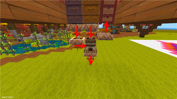 下一步就是关键的一步了,找好位置,在工具的下方放置好漏斗和熔炉,这里一定要注意自己这两样物品摆放得位置,当然通过别的方法也可以实现,不过这里放的是我自己的想法啦