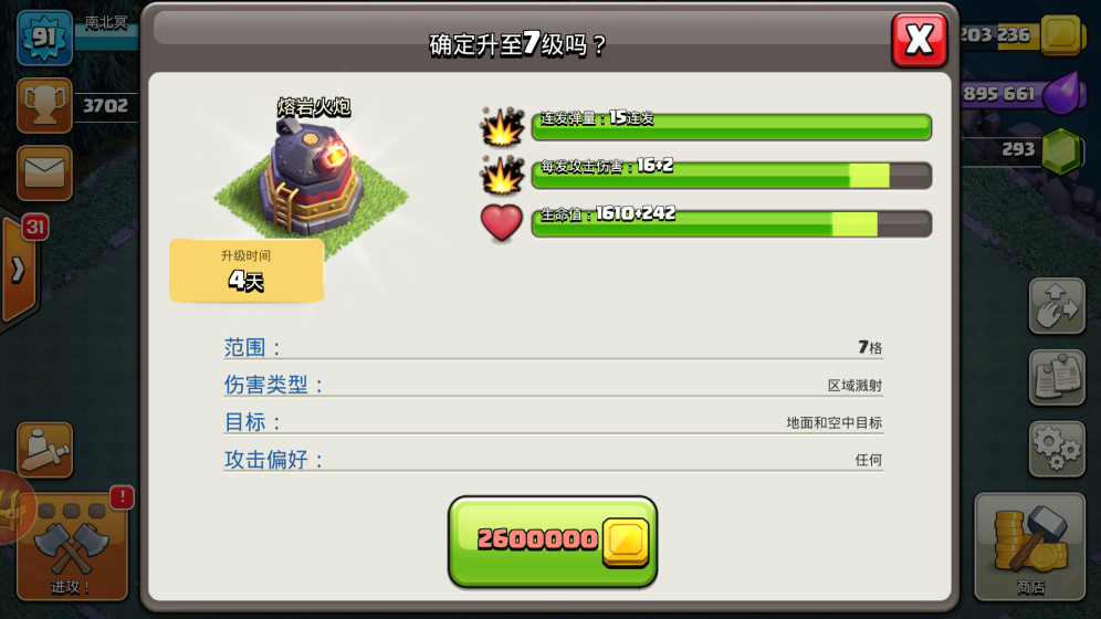建筑升级顺序:巨型加农炮→熔岩火炮→迫击炮→箭塔→防空火箭→撼地巨石→炸弹发射器→电磁塔→加农炮→陷阱