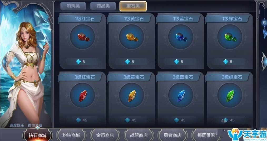 在钻石商城、粉钻上传和战盟商店都可以买到宝石。需要注意的是,钻石是直接充值的,绑钻是系统赠送的,两个地方所出售的道具都是不一样,绑钻不能在钻石商城中购买。钻石商城中有各个等级的宝石出售,越高级的钻石越贵,不建议平民玩家直接购买。