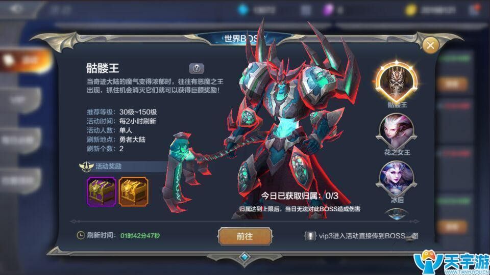 击杀世界BOSS相信现在大多数玩家很常见,世界boss的能力非常强大,需要组队才能杀死,BOSS死后会有宝箱,开启后将获得大量宝石。