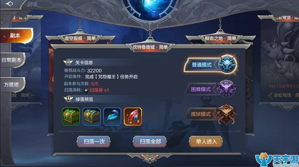每个副本每天均可参加5次,宝石的收获也颇丰的。深渊模式的副本每次均可获得1级的红、蓝、黄、绿宝石各一个,还能获得洛克之羽和各种装备。以300级的玩家为例,如果7个副本都刷的话可以获得红、蓝、黄、绿宝石各35个,收获还是很可观的,只是需要花点时间去刷副本。若不想一个个刷的话,也可以用扫荡券或钻石扫荡,5次100钻石(有点小贵~),平民玩家不建议用钻石扫荡,土豪随意。