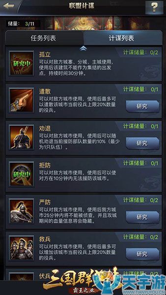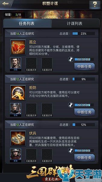 当联盟盟主、副盟主或谋士开启了联盟计谋研究后,联盟成员可派遣属性达到目标要求的武将进行计谋研究,完成规定时长的研究任务后即可获得相应的联盟贡献值,并且增加联盟计谋的研究进度。联盟计谋目前共有7种,接下来我们就来看看不同计谋的具体用法。