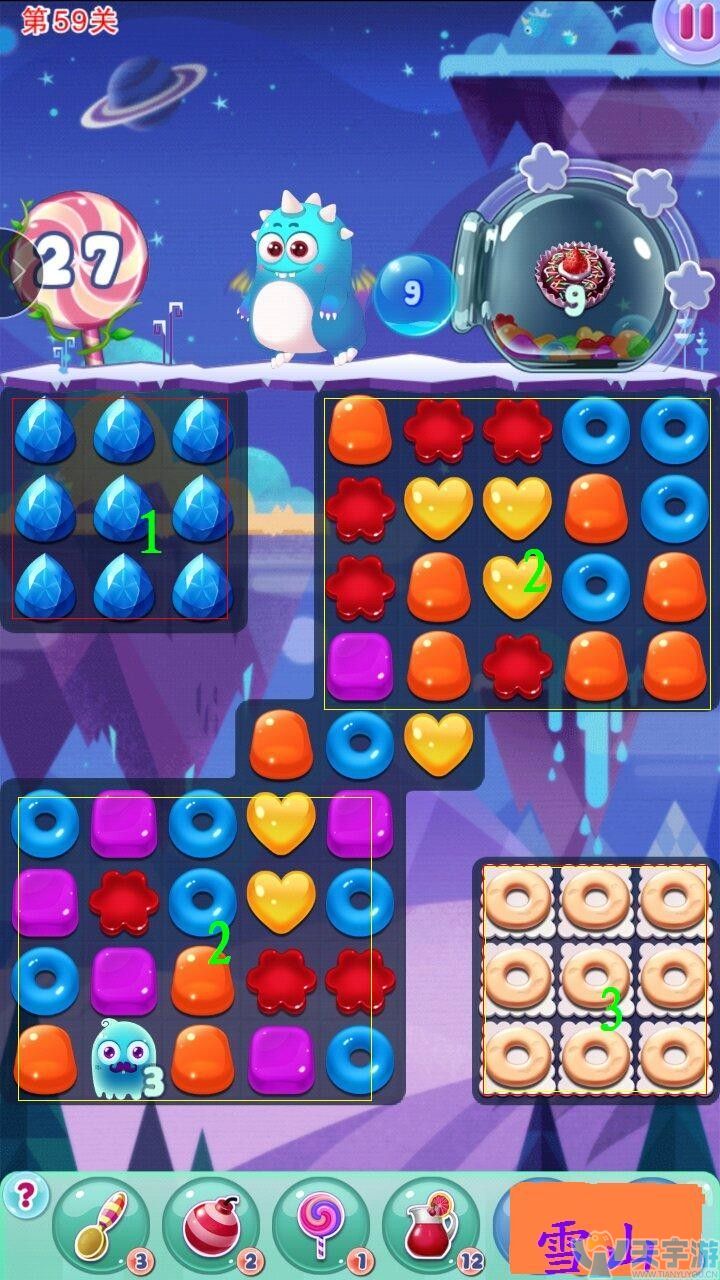 1.在贴着幽灵大叔的位置消除糖果,消除够幽灵大叔右下角的数字后,幽灵大叔就会发挥作用,消除区域1里的全部蓝宝石,给小呆充能,切记尽量不要让幽灵大叔从上方跑掉哦,那就要从头开始了。