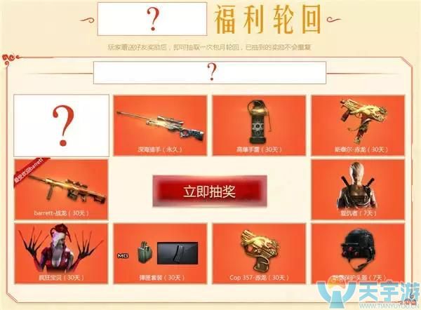 福利轮回板块跟新年神枪节板块是相衔接的,只要成功赠送一次道具给好友,就可以在福利轮回板块中获得一次抽奖机会,而且已经抽中福利道具不会重复获得。另外在福利轮回中有一个奖池栏是空的?这个空奖池栏会是什么神秘福利呢?一些有印象的玩家应该还记得,在这个福利轮回板块开启之前,这个板块位置上注明的是QB轮回!难道这个还未揭晓的神秘福利会是QB?难道这是过年马老板给我们发放的“压岁钱”?或者是什么包月特权服务?