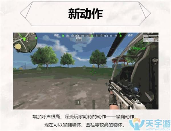 玩家在贴近较高的墙体、围栏不能直接跳过时,可同时滑动前进摇杆并点击跳跃键进行攀爬移动。攀爬移动可以帮助玩家迅速攀越较高的墙体等障碍物,使玩家在战斗或逃生时更加迅速,也是游戏的战斗、移动更加灵活细腻。所以此次增加攀爬动作对广大玩家来说大有益处。