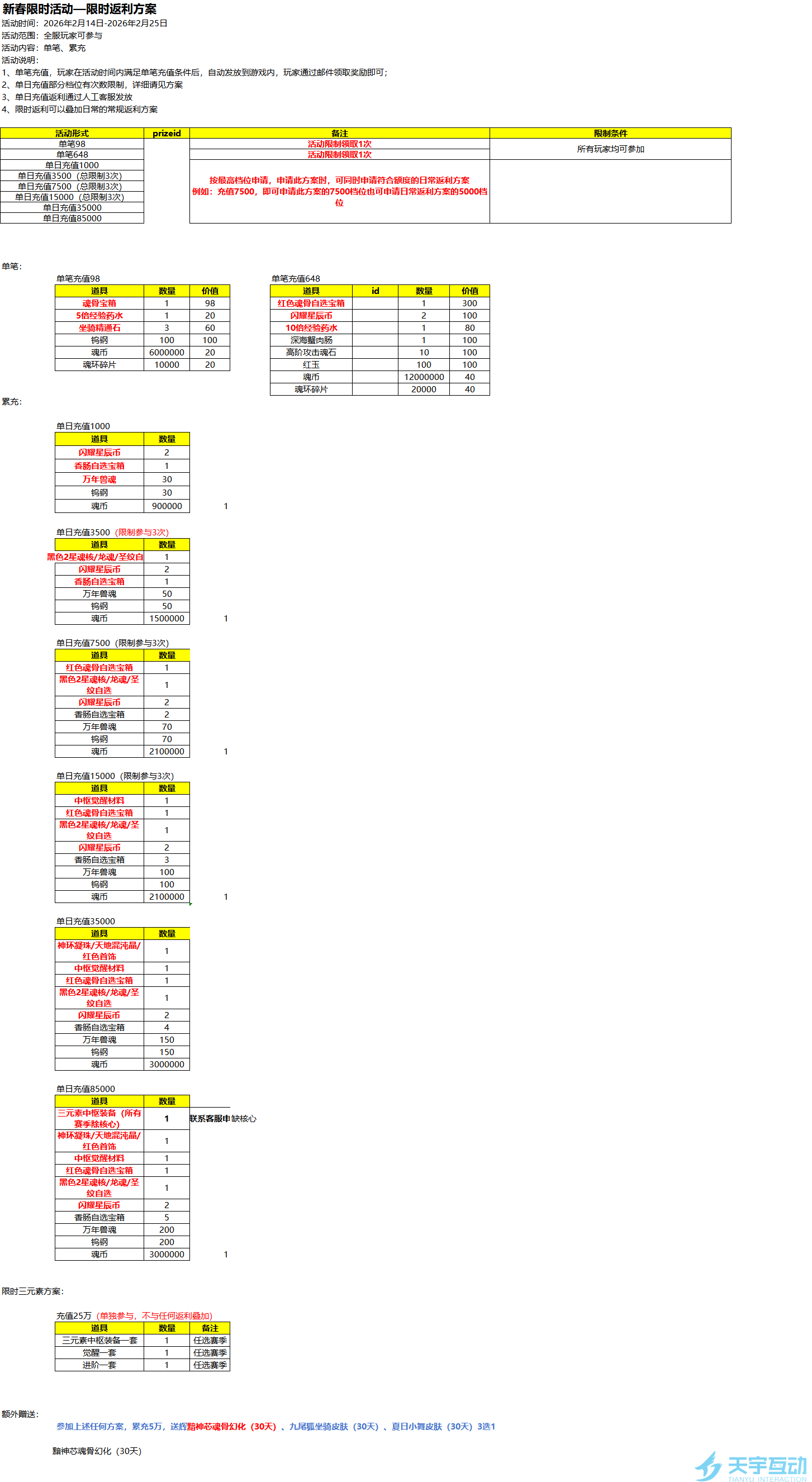 活动时间:12/30~1/4,持续6天日充3W(含代金券)学院试炼周单日累充返利A,活动期间最多参与4次日充4W(含代金券)学院试炼周单日累充返利B,活动期间最多领取2次分类奖励内容分类奖励内容基础奖励百炼神核*1或者淬火石铠*1(自选礼包)基础奖励毛虫肠*2淬火石4选1或者深海沉银*1(自选礼包)百炼神核*1或者淬火石铠*1(自选礼包)2星红色魂核*1或者红色普通仙草*1(自选礼包)淬火石4选1或者深海沉银*1(自选礼包)高级魂兽内丹*1或者普通魂兽内丹*2(自选礼包)2星红色魂核*1或者红色普通仙草*1(自选礼包)10倍经验药水*3高级魂兽内丹*1或者普通魂兽内丹*2(自选礼包)红玉*5010倍经验药水*3魂币*3000W红玉*80魂环碎片4W魂币*6000W额外奖励(开启神界中枢,约开服140天以上)满元素斗铠(除头盔外的部位)10个选1个或者满元素秘法(除大脑外)7选1每次只能从中选择一件,若多次参与,同类物品不能选相同部位魂环碎片6W神之合金*1或者万载玄冰髓*1(不可交易!)额外奖励(开服140天以上)满元素头盔斗铠或者满元素大脑秘法(二选一,每种只能拿一次,例:首次选头盔,第二次只能选秘法)额外奖励(未开神界中枢,约开服140天以内)毛虫肠*1神之合金*2或者万载玄冰髓*2(不可交易)红色魂灵选择宝箱*2额外奖励(开服140天以内)神环凝珠*1魂环碎片*5W高级内丹*1活动规则:1、活动时间12月30日00:00-1月4日23:592、限定次数内,达到条件即可持续参与。例:单日累充7W可以获得返利A*1+返利B*1或者返利A*23、开服140天以上的的区服ID范围 (10001-15512),即(昊天1服——昊天5512服),有存疑的可咨询客服核实。1月5号之前申请