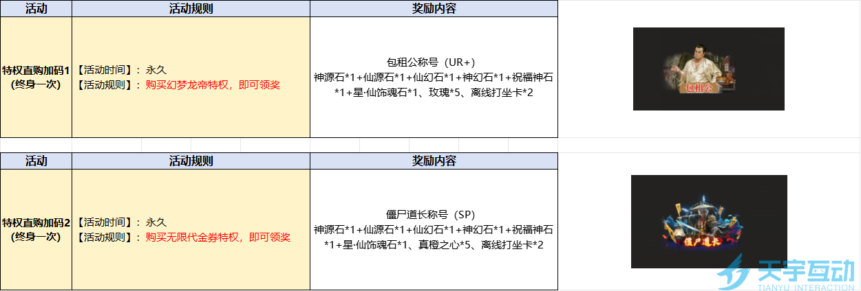 进游福利礼包名称礼包内容使用限制领取条件发放方式超级加倍·进游福利648代金券仅可领取1次1级默认自动发放手动发放联系运营设置648元充值卡*10、铜钱*9999999、钻石*99999999时光币*10、龙神币*30、小冰棍*99独家礼包春草萌萌*1、雪人奴奴*1、老铁*1、步步高升*1灵丹战力礼包生命灵丹*99、攻击灵丹*99、防御灵丹*99、破甲灵丹*99(领取后自动使用)专属礼包3级红宝石*1、3级蓝宝石*1、钟爱烟花*10、玫瑰花束*2神龙大礼包古寺幽龙*1甄选时装礼包梵天印魔器*1、屠苏送福*1、天玄尊仙*1、萌兽出击*1SVIP礼包黄金SVIP·季度卡游戏内自动到账宝石战力大礼包1级骑装神器宝石随机礼包*990生肖铸魂大礼包魂力*990灵石战力大礼包初级灵石随机包*990天神秘钥大礼包天神秘钥*9990战力大礼包初级进阶丹随机礼包*990每日签到/直播间打卡328元充值卡、时光币*10每日可领取1次联系客服领取福利系统-每日打卡手动申请-自动审批-直接到游戏内邮件冲级奖励礼包名称礼包内容使用限制领取条件发放方式140级礼包198元充值卡、小冰棍*10、时光币*2仅可领取1次140级默认自动发放手动发放联系运营设置180级礼包328元充值卡、小冰棍*20、时光币*3仅可领取1次180级220级礼包648元充值卡、小冰棍*30、时光币*5仅可领取1次220级260级礼包1000元充值卡、小冰棍*60、时光币*10仅可领取1次260级300级礼包2000元充值卡、小冰棍*100、时光币*15仅可领取1次300级340级礼包3000元充值卡、小冰棍*200、时光币*20仅可领取1次340级380级礼包4000元充值卡、小冰棍*300、时光币*30仅可领取1次380级420级礼包5000元充值卡、小冰棍*500、时光币*50仅可领取1次420级战力达标福利战力目标奖励道具领取方式1000w战力328元充值卡福利后台-战力福利5000w战力1000元充值卡1亿战力2000元充值卡5亿战力3000元充值卡10亿战力4000元充值卡50亿战力10000元充值卡80亿战力20000元充值卡100亿战力30000元充值卡200亿战力40000元充值卡500亿战力50000元充值卡月卡福利(领取满足最高档位领取为准、不叠加领取)月卡档位月卡奖励领取方式累计充值30元每天送30元充值卡,连续30天福利后台-月卡累计充值68元每天送68元充值卡,连续30天累计充值98元每天送98元充值卡,连续30天累计充值198元每天送198元充值卡,连续30天累计充值328元每天送328元充值卡,连续30天累计充值648元每天送648元充值卡,连续30天累计充值1000元每天送1000元充值卡,连续30天累计充值2000元每天送2000元充值卡,连续30天累计充值3000元每天送3000元充值卡,连续30天累计充值5000元每天送5000元充值卡,连续30天累计充值10000元每天送10000元充值卡,连续30天累计充值20000元每天送20000元充值卡,连续30天