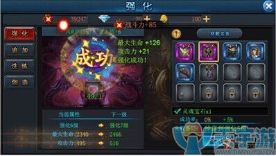 第1步:强化 开启等级 16级 强化装备是最基本增强装备属性,提升战力的方式。进入“锻造系统”的强化界面,选择你想要加强的武器,然后点击强化即可。 需要注意的是,前期的强化需要消耗“初级祝福宝石”,随着装备强化级别越高,每一次强化需要的“初级祝福宝石”会越来越多,所需材料数目与强化等级相同哦,也就是说强1需要1个初级祝福宝石,强2需要2个初级祝福宝石,异常类推……在这里小编建议选择合适的装备来进行强化,有助于等级的快速提升哦~