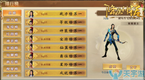 排行榜功能开启后,点击“排行榜”按钮即可进入,排行榜共分为总榜、战力榜、等级榜、红颜榜、坐骑榜、仙翼榜、神装榜、爵位榜、观星榜、成就榜、横扫榜,每个榜单收录了排名前100的玩家。