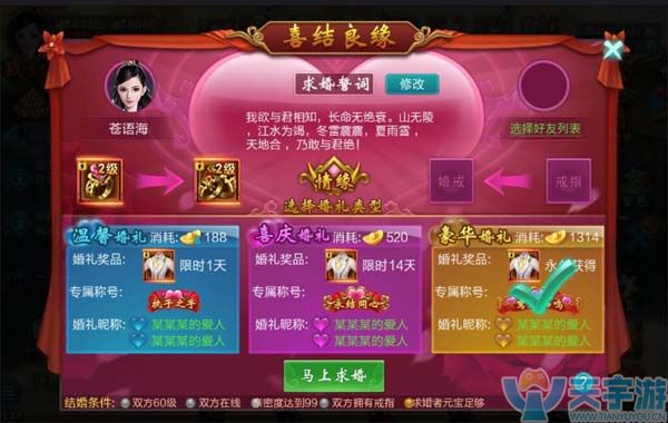 1.婚礼分为温馨婚礼、喜庆婚礼、豪华婚礼三种,不同类型婚礼的奖励、称号以及所需要消费的元宝数量不同;