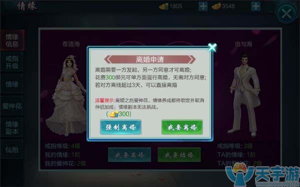 2.单方强制离婚,为单人操作,需要扣除发起方300绑定元宝。