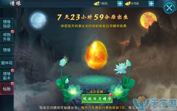 2.吸收日月精华可加速出生,双方每天可免费和付费各吸收一次,每次加速6.0小时。