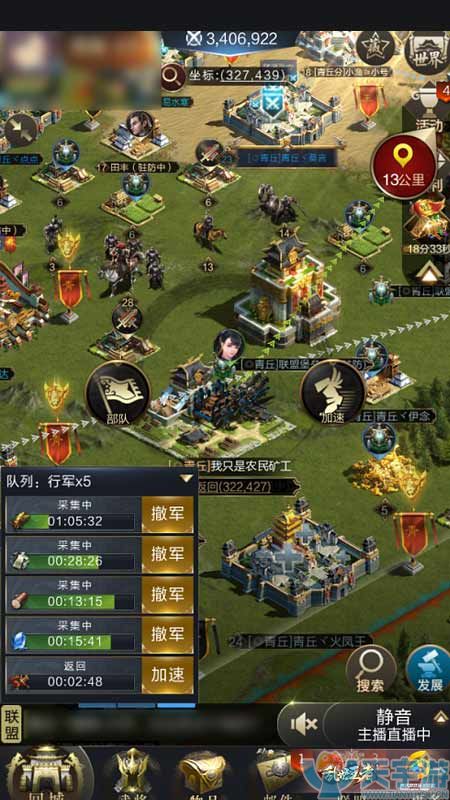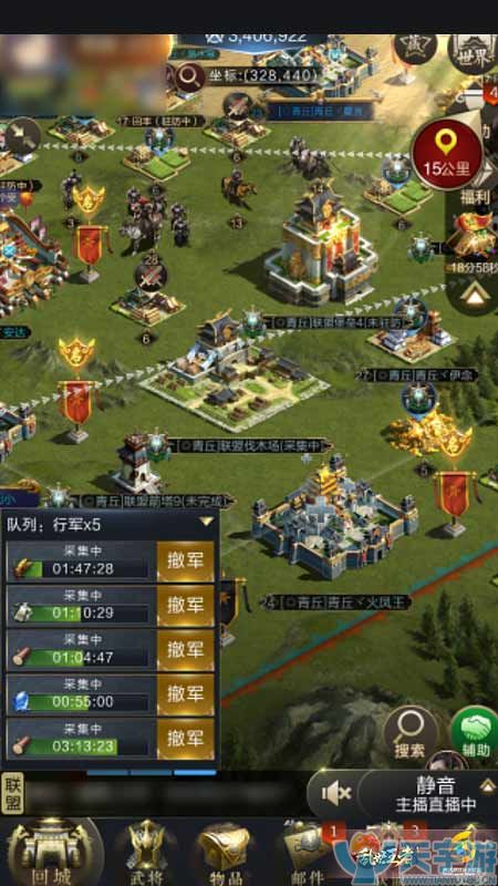 只要利用直接减去一半总时间的判定,我们直接去资源田(联盟矿)掌握好时间,等到5个队伍同时到每块田一半时间的时候使用快速采集,五个队伍同时回城。然后再派出去采集2小时,就可以多出前面50%的收益。
