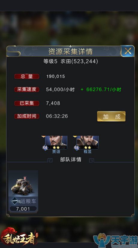 乱世王者中大家都只要造很多运粮车,但是很多玩家并不知道自己要造多少运粮车才刚刚好,其实运粮车和玩家校场等级、武将技能、部队负重、资源田等级都是相关的,要想详细计算十分复杂,下面就给大家介绍一个最简单的方法,任何玩家都可以轻松计算出当前大致需要多少运粮车才刚刚好。
