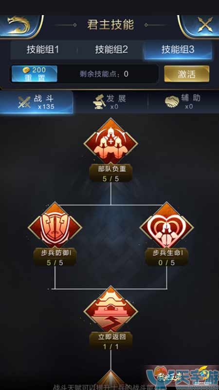 第五支第六支这里一定要注意,不能三个全点,建议只点一列,马超赵云培养的好可以选择骑兵这一列。周瑜培养的好可以选择弓兵。只点一列是为了更早的点出战斗终极神技,救援(攻城死兵变伤兵)救援的重要性无需多言。随着游戏发展到中后期,君主等级达到38级的越来越多。因此,越早点出越好。
