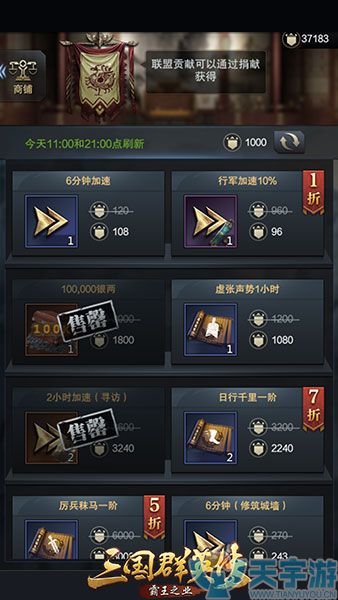联盟商店的折扣十分诱人,1折、5折、7折十分常见,对于君主们来说,只要是打折的道具都是及其赚的。但是在道具的选择上,打折的道具不一定是需要的,一般加速道具、资源、建筑道具,即使没有打折,都是必扫道具。
