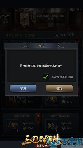 既然用不完贡献,不如手动刷新商店。联盟商店的刷新可谓是十分为君主们考虑,不管刷新多少次都只消耗1000的贡献值。这样君主每日获得的贡献可以维持联盟商店刷新3次左右,这样就大大加快了君主的扫货效率,对道具资源的积累起着重要作用。