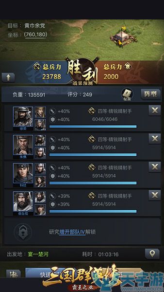 第一支部队,进攻2000公里以外的黄巾余党,个人建议派遣速度较慢的部队(弓兵军团)至于步兵军团,则是寻找距离较远的矿洞,既可以转移兵力,也可以进行采集,可谓是一举双得。