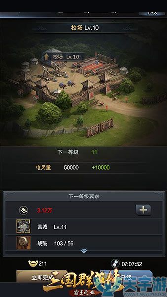 校场的升级跟其他建筑物升级有很大的不同之处。一般来说,升级一个建筑需要资源就行,但是升级校场还需要战鼓这个道具,而且校场的等级越高升级所需要的战鼓也就越多。